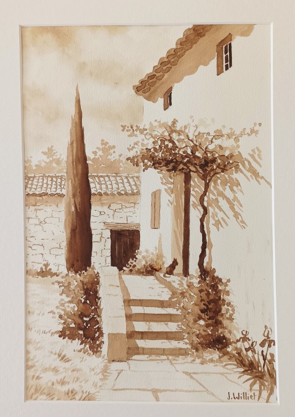 Ces paysages sont visibles à la galerie de Roussillon. Pour le moment on ne peut pas dire que le début soit folichon, les visiteurs sont un peu frileux, mais il reste toujours l’espoir et les belles rencontres pour remonter le moral.. J’ai également eu la visite fort sympathique de Marie Odile (participante aux exercices) que je salue ; son commerce de protoxyde d’azote ne marche pas bien non plus, mais il reste la contrebande.. (heureusement qu’on peut plaisanter encore avec certaines personnes..!). J’en profite pour remercier les fidèles lecteurs de mes articles, et tous les mails bienveillants que je reçois et auxquels je ne peux pas toujours répondre.. Je pense par exemple à Elisabeth qui m’a dit (par rapport au prix des carburants) que le voyage de papier offert par mes aquarelles dure plus longtemps. Merci beaucoup ! C’est vrai que l’Art est un voyage, une rencontre avec une vision d’artiste, et une oeuvre est un transport spirituel , émotionnel et poétique, au delà même de l’énergie renouvelable.. C’est une chance..