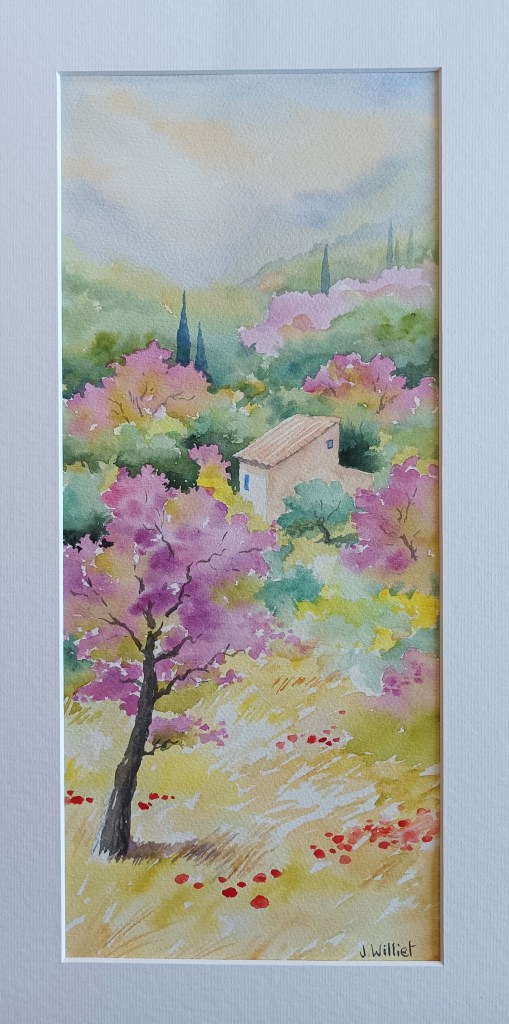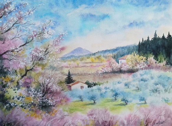Voici une version d’un paysage fleuri près du Barroux, pas loin de Malaucène, avec des amandiers en fleurs et des oliviers ; un format 30×40 cm sur Canson Montval :
