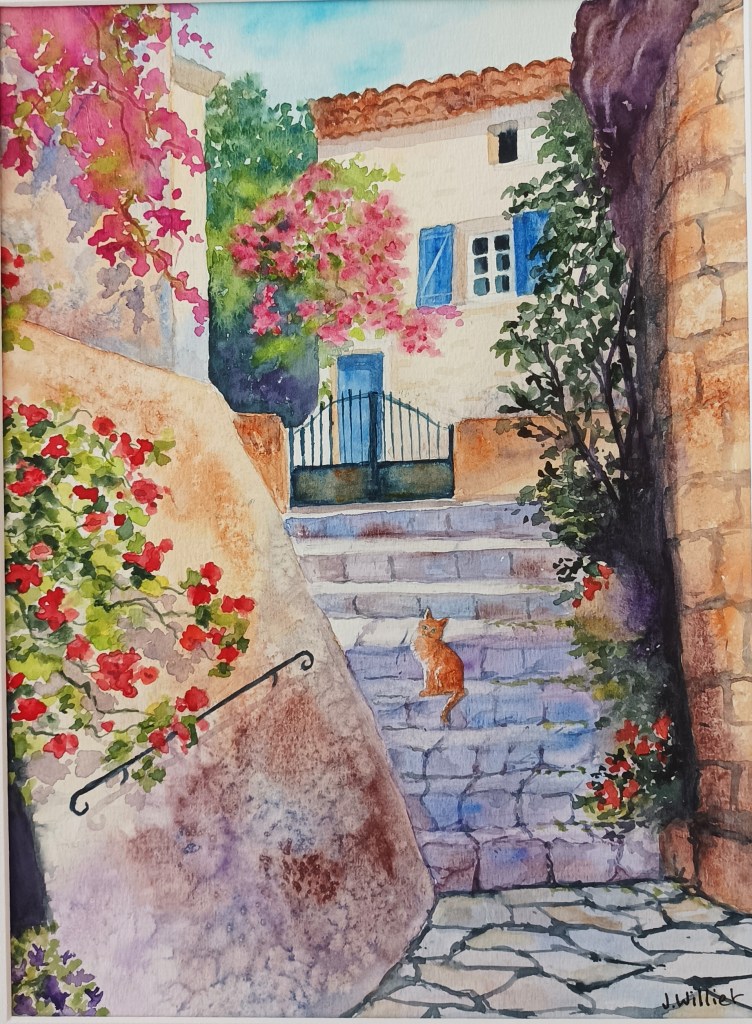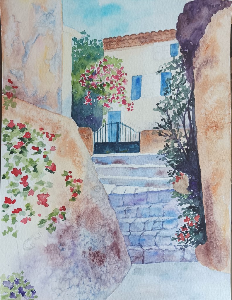 Si vous vous souvenez de l’aquarelle de l’impasse de Séguret, fin décembre je crois, j’y ai rajouté un chat en haut de l’escalier. J’ai aussi recueilli cette aquarelle d’une élève sur ce sujet., qu’elle voulait abandonner ; je vous montre sa version à l’abandon et sa version restaurée :