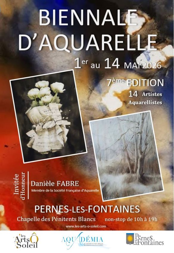 A propos de corrections, j’ai posté mes commentaires aujourd’hui sur les participants aux exercices ; les prochains sujets seront proposés le 1er mai, (oui je travaille aussi le 1er mai).. Ce jour là sera d’ailleurs le jour d’accrochage et de vernissage de la Biennale d’aquarelle de Pernes les Fontaines. En voici l’affiche :