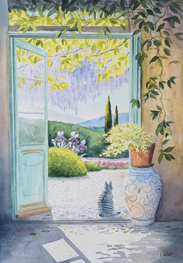 Sérénité du matin (35×50 cm sur Arches). Un instant saisi, immobile, sur un jardin qui nous transporte, loin d’ici. Le chat est contemplateur. Dans toutes mes aquarelles vous aurez compris qu’il me représente en quelque sorte, comme Hitchcock dans ses films, un genre de signature.. (Mais je dors beaucoup moins quand même..). Cette aquarelle réalisée en cours, par étapes, fut assez longue à finaliser. Elle est plutôt complexe, mais elle plait bien.