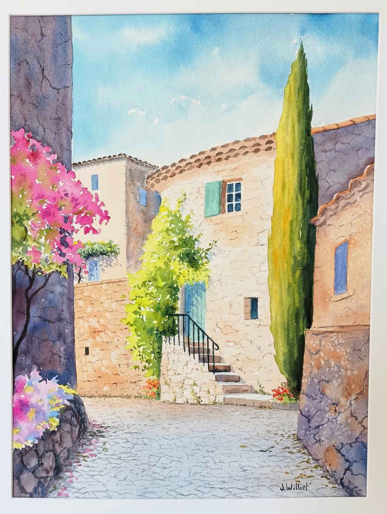 J’ai aussi peint cette ruelle fleurie, une de plus, dans un format plus petit hier :
