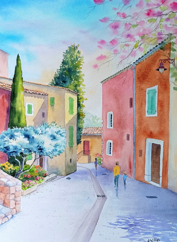 A propos de Roussillon j’ai pu finir la version d’un des exercices de ce mois : Une balade dans les rues du haut village, près de l’église :