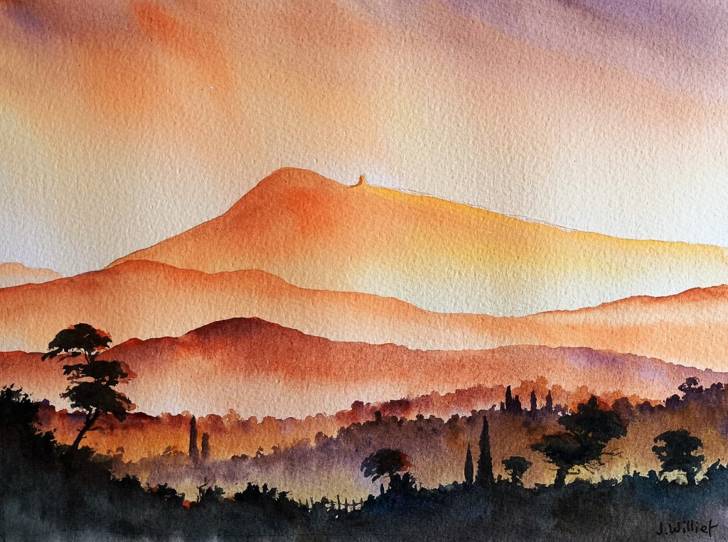 Dans le lot de visiteurs, il arrive donc qu’il y ait ce genre de personnes ; mais fort heureusement ils sont minoritaires. C’est donc pour la majorité que je dédie cette petite aquarelle de lumière sur le Ventoux :