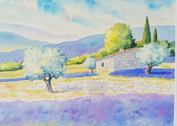 Le 1er août marque aussi la mise en ligne des nouveaux sujets d’exercices, il y a le choix entre les Dentelles de Montmirail, une plage à St Raphaël et des poivrons jaunes.. A vos pinceaux ! Le changement de mois signifie aussi des augmentations régulières, comme l’abonnement EDF par exemple, mais heureusement il y a aussi des baisses, comme celle du taux du livret A (Ah mince ! Mauvais exemple).. Bon, au point où on en est, ça ne change plus grand chose.. Restons focus sur les joies de peindre à l’aquarelle, le titre de cet article est d’ailleurs juste un clin d’oeil au fait que depuis janvier sur ce blog ce n’est pas moins de cent aquarelles différentes que je vous montre ici… c’est du travail ..!