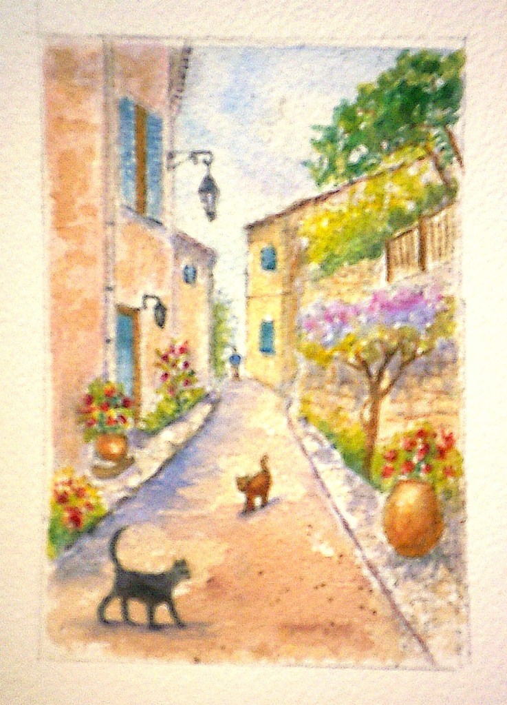 Voilà qui est joliment coloré, plein de vie, c’est une belle réinterprétation de la photo.. Il y a de petites erreurs de cohérences d’ombres sur la gauche (et un petit lampadaire en trop, pas nécessaire) mais la joie de votre peinture fait oublier cela..