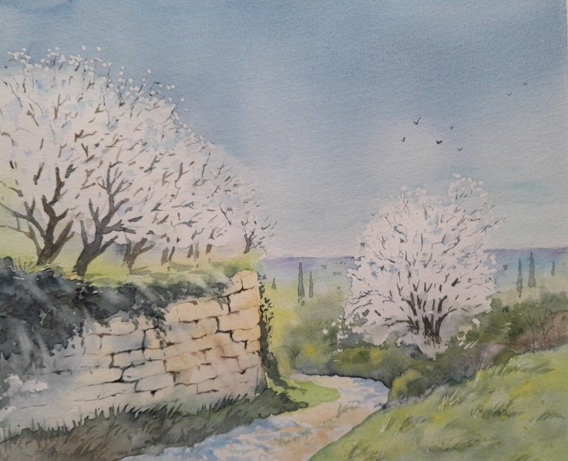1. Très bon travail sur le mur et la cohérence globale, en revanche il ne serait pas inopportun d’avoir quelques touches rosées par endroits pour varier de la blancheur des amandiers ; le nombre de branches pouvant diminuer, le bleu du ciel s’intensifier, pour faire ressortir la blancheur..