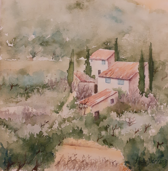Il y a de très bonnes choses dans votre aquarelle, une bonne technique qui se marie parfaitement avec l’entourage du mas et l’arrière plan.. Le 1er plan est moins « léger », sans doute trop fidèle à la photo..