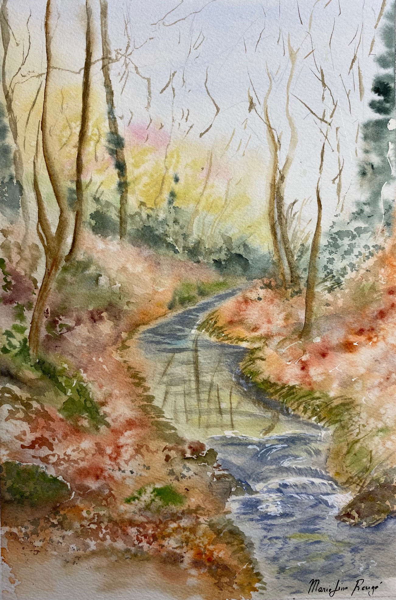 Votre aquarelle est assez intense, ce qui est bien pour les rives et les arbres, mais la rivière et ses reflets mériteraient plus de douceur ; pour le haut je pense qu’on est entre deux, soit s’appliquer soit davantage suggérer des frondaisons..