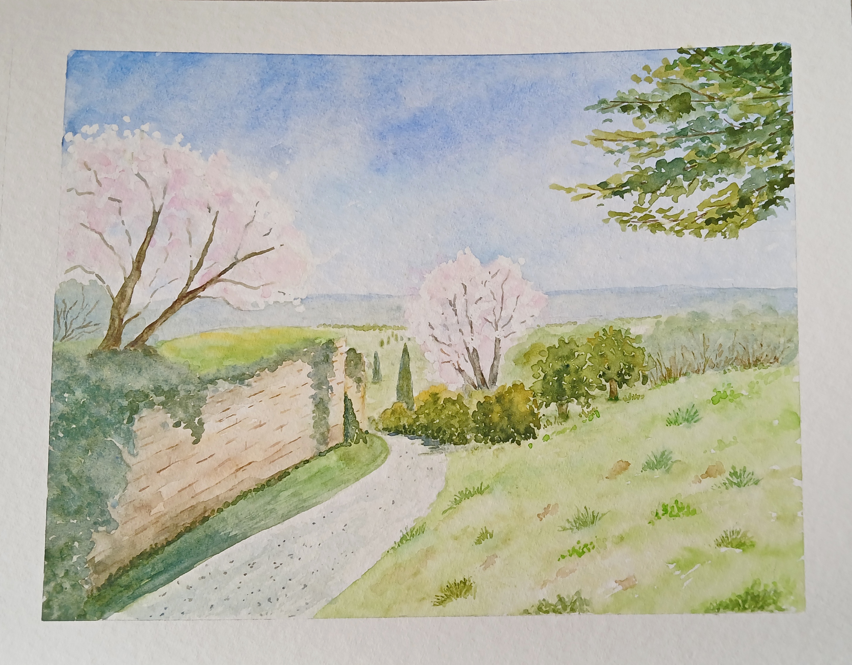1. Vous avez bien géré les dosages de pigments, le ciel notamment et les feuillages ; en revanche il y a trop de dureté dans la ligne du mur (surtout en bas), idem dans les troncs et les branches qui peuvent être plus fournis. Les touffes d’herbes peuvent être plus discrètes..