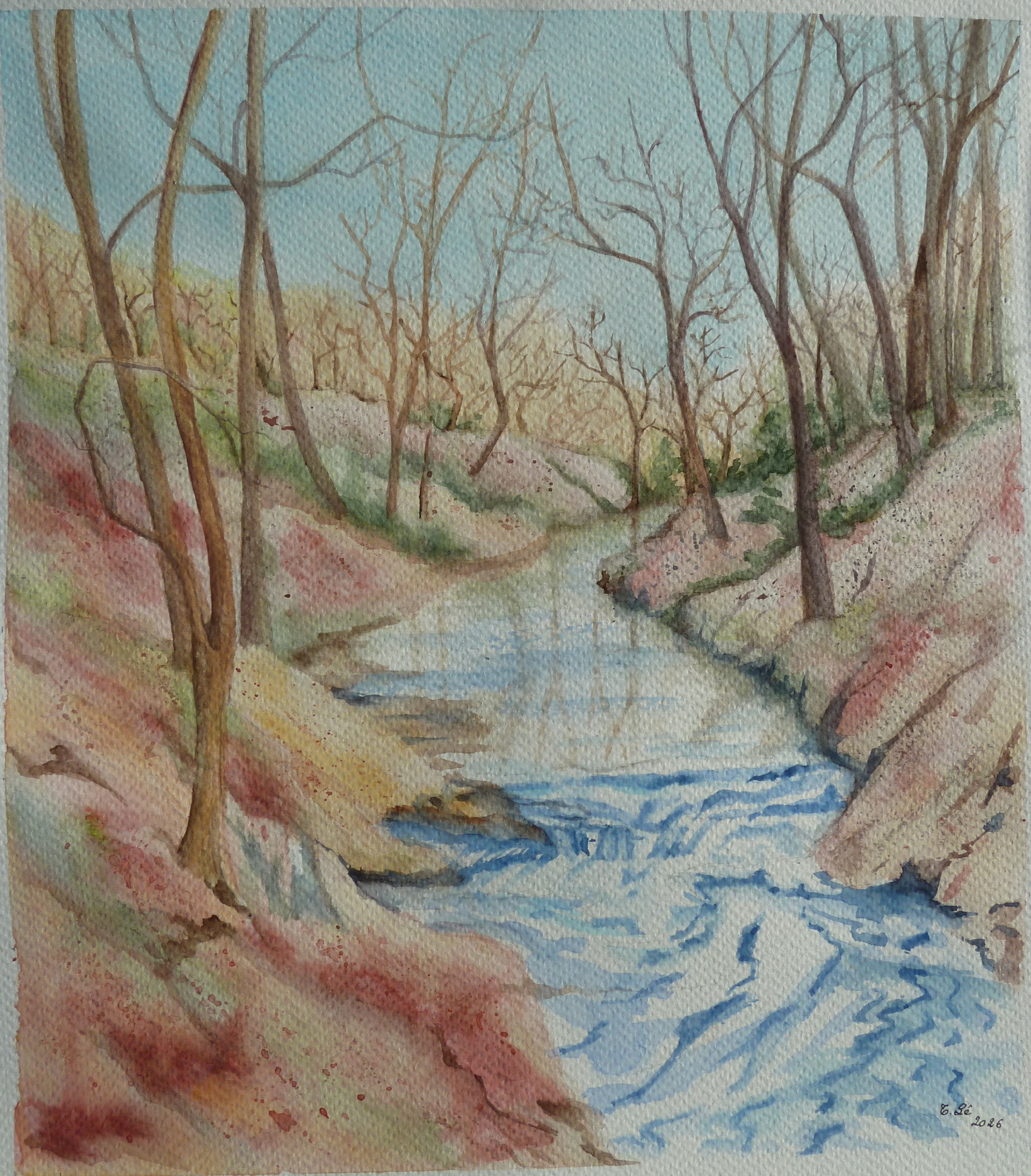 Une belle interprétation rigoureuse, de la profondeur, c’est plutôt réussi ; personnellement j’aurais peint moins en jaune ocre la lisière du fond (plutôt bleuté) et j’aurais rajouté quelques masses de feuillages d’automne dans les hauteurs de certains arbres..