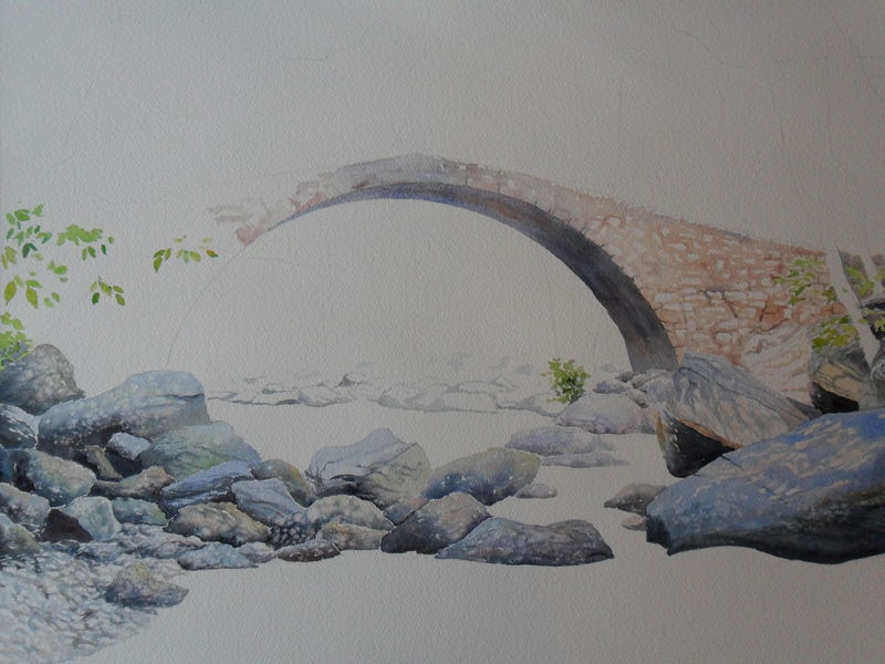 Voici six photos retraçant la réalisation d’une aquarelle pas à pas, à partir d’une photo du pont de Zaglia, en Corse.